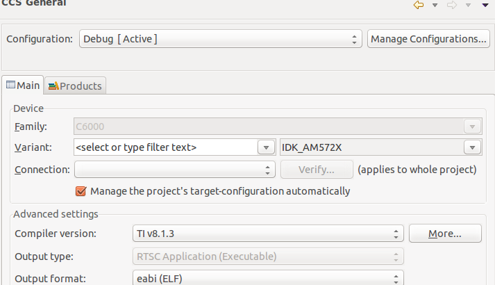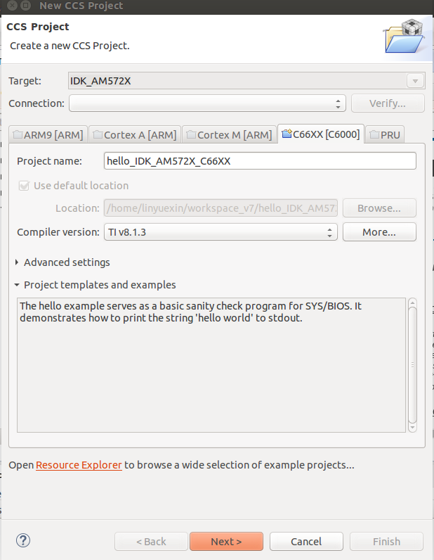 对于由 pdkprojectcreate 脚本创建的工程、器件为"通用 C64x+器件"、这无关紧要、因为我们为 C66x 使用了-mv 6600选项。 该平台来自 SYSBIOS 软件包本身、在 packages/ti\platforms 下、它具有 evmAM572x 和 idkAM571x、idkAM572x。 当我们通过脚本创建项目时、它会选择平台。