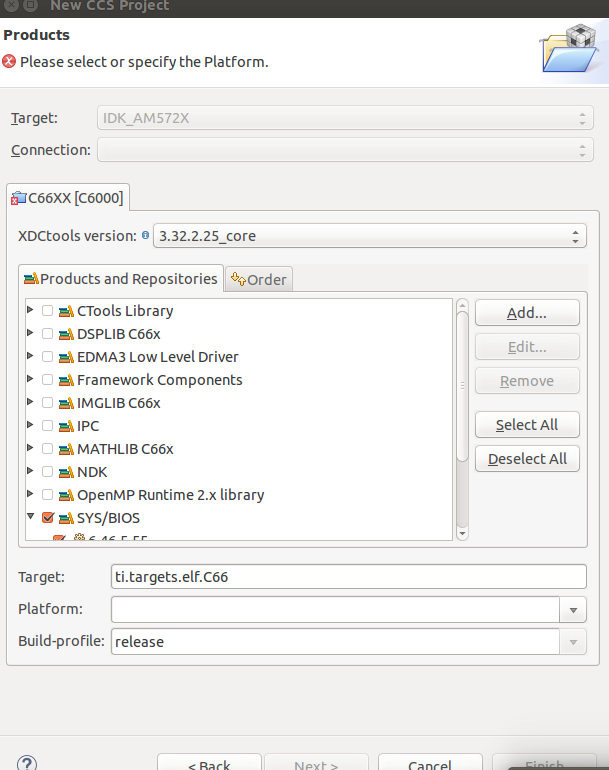 我设置了默认配置。但是在平台下拉列表中只有 evm572x (我自己输入 idkAM572x?)。