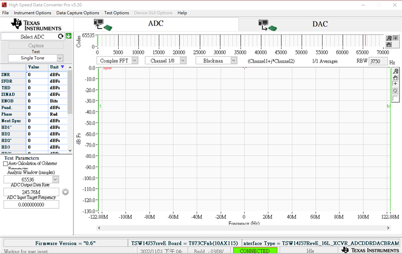 要正确使用 DDR 固件、您必须首先上传固件 "仪器选项">>"下载固件">"TSW14J57RevE_16L_Xcvr_ADCDDRDACBRAM.RBF"。 然后您可以选择您的 ini 文件、并在请求更新固件时按"否"。 一旦设置了该值、您就可以使用 DDR 来捕获数据。
