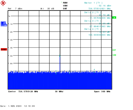 以下是不处于仅 NCO 模式时的输出捕获图、I 和 Q 样本都恒定为零。 NCO 设置为726.5625MHz。