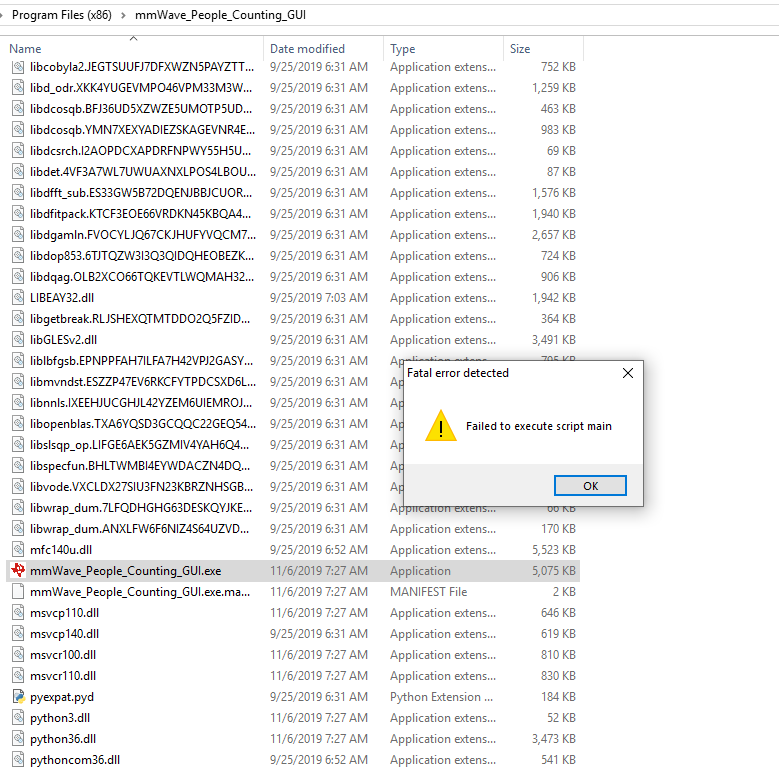 我想为 ODS ES 2.0运行新的3D PPL 计数实验室(工业工具箱4.1.0)、但在安装 mmWave_People_Counting_GUISetup.exe 后、可执行文件"无法启动脚本 main "。