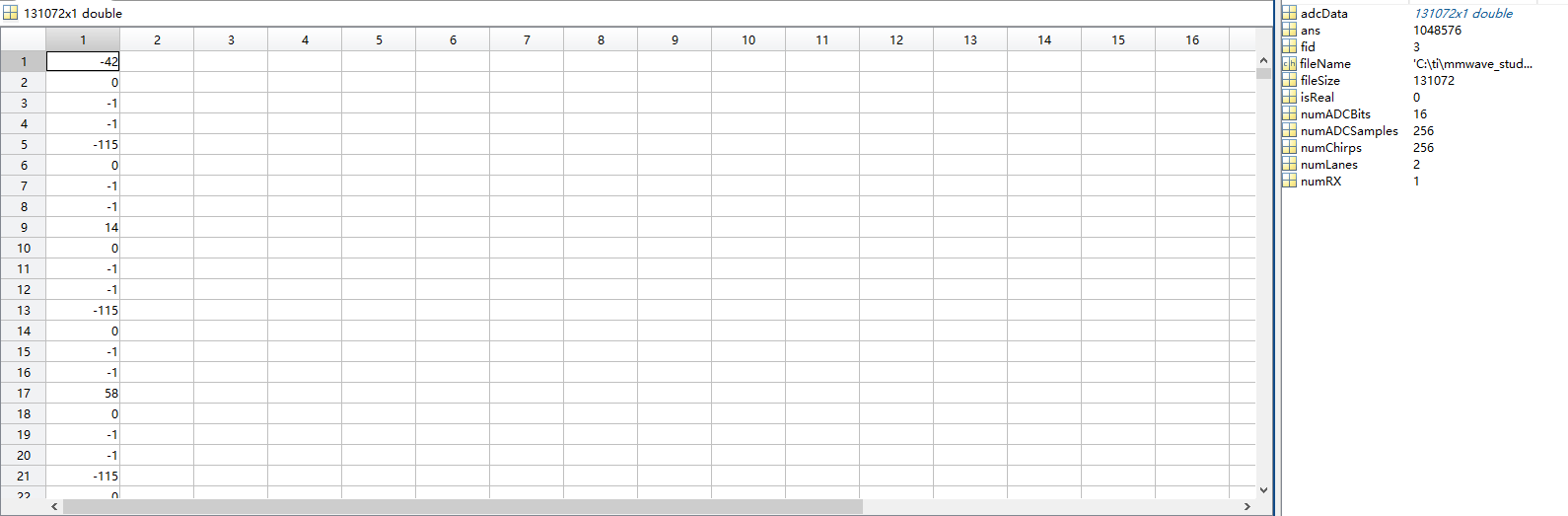 我使用 AWR1843和 DCA1000捕获数据并读取 mmWave Studio 生成的二进制文件 adc_data.bin。