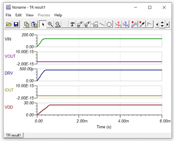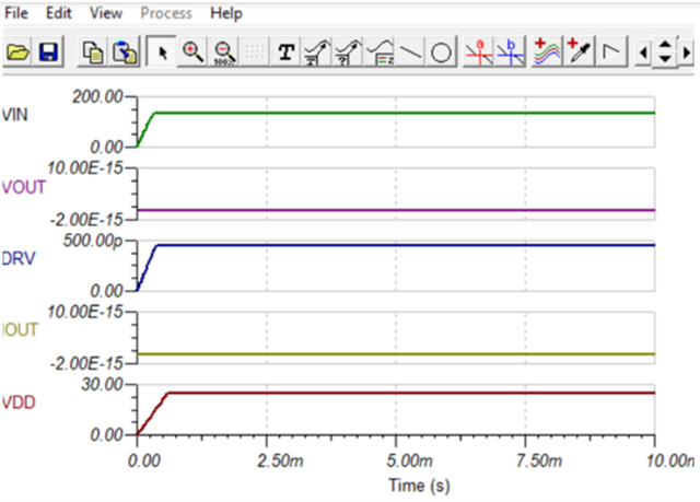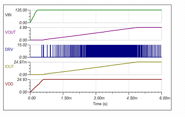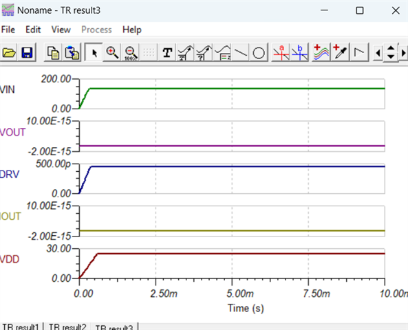 我尝试使用 UCC28710模拟反激式转换器。 我从德州仪器(TI)网站获得了 UCC28710 TINA-TI 参考设计文件。 我得到了仿真得到的不同结果。 DRV 信号不会产生脉冲来驱动 MOSFET。 请查看下面的结果。 您能否说明一下、为了使参考设计正常工作、我是否需要考虑任何因素?
