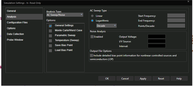 2.似乎无法进行交流扫描。 结果将专用于不正确的仿真曲线。 请参阅随附的图片。