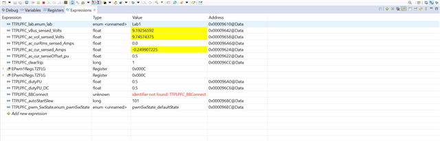 在 main.syscfg 中、我将工程选项更改为 lab1。 但调试运行时、“TTPLPFC_lab.enum_lab"始终“始终显示 lab4、“autoStartSlew"为“为 0。 我将“settings.h"代码“代码 “#define TTPLPFC_LAB 4“更改为“#define TTPLPFC_LAB 1“。 这是我更改了代码的唯一一件事、代码直接下载到您的网站上并复制到工作区。