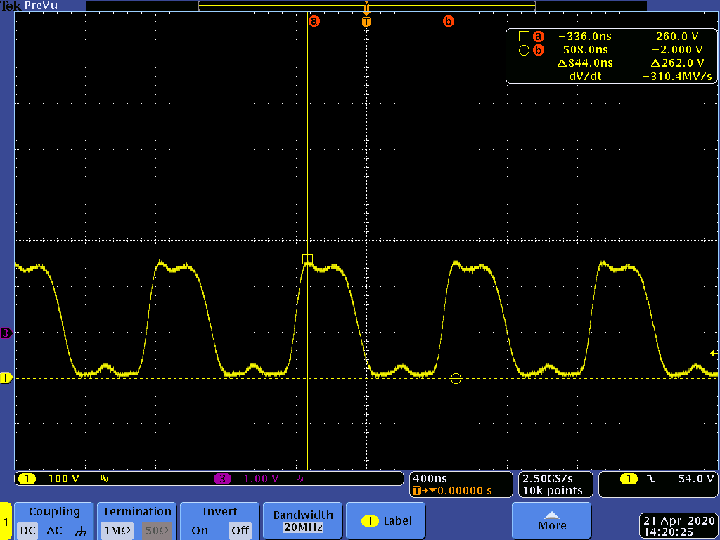 说明:我将根据您的 TIDA-00961软件指南(文件编号 TIDUDU4C)在开环模式(构建1)下推出 TIDA-00961 GaN CRM 图腾柱 PFC 转换器。 在第15页、P3.5.1.6显示了图7、因为我应该在100VDC 输入和333 Ω 负载输出时获得的开关节点电压。 它还指出、我应该看到大约122Vdc 的输出。 当我执行开环步骤时、我在 J201开关节点1处获得以下波形。 我还有232 Vdc 输出(ton = 20)、负载设置为330ma。 当查看 LS 栅极1信号(J204-2)并看起来正常时。 J204-1 HS Gate1信号最初是“正常”信号,但当输入高于约50Vdc 时会变为低电平。 其他 GaN FET 对(J209)也是如此。