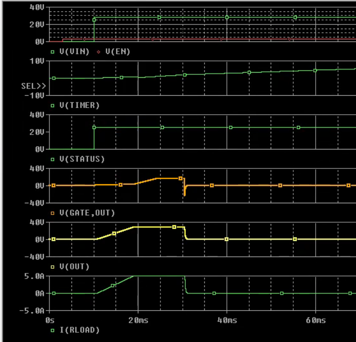 将 Vsense 电阻器更改为1.5k、以将所需的 Idsth 设置为6.4A。 器件未在仿真中打开。 当输出端的负载为5A 时、请告诉我仿真中是否缺少任何内容、如果 Vsense 电阻器值为9.09k、则效果良好。