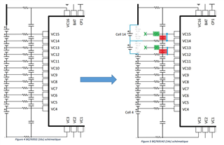 Q3) 是否可以在同一 PCB 中将 BQ76952替换为 BQ76942或 BQ769142? (与下图相同(用 BQ769142替换 BQ76952) 16s=>14s:用分流电阻器替换电容器...)