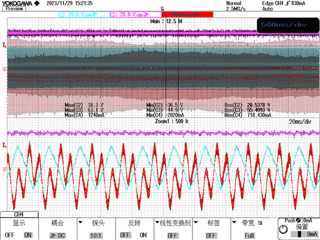 问题似乎已经发现、今天、我发现直流/直流转换灯上的 AB 相驱动 Q4 Q3没有亮起、我测试并发现两个 MOSFET 栅极-源极短路、MOSFET 损坏、我更换后做了一个小实验、 在我的基准电流中基准电流还没有被切断到负载中、电压20V 的交流到 rms 值、直流电压上升到500V、在第二个实验之后、 把负载切换到电流的参考值、给出参考值的阶数、得到电压和电流的 C 相、以及直流母线电压的值、如下图所示、这种是正常的、对吧。 紫色电压、红色电流