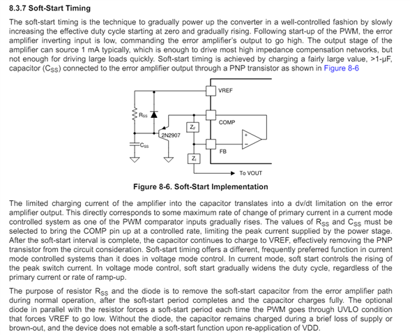 UC3845没有软启动。 下面 是过滤后的包含集成软启动的通用 PWM (GPPWM)参数列表。 对于不包含软启动功能的 GPPWM、可根据应用于 COMP 的 RC 时间常数在外部添加它、如下所示。