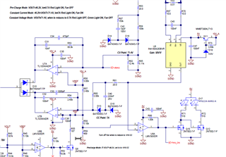 TL103W 具有内部2.5V 基准。 CV 环路使用该引脚设置电压调节点以及由 R62、R65、R64和 R63构成的 FB 分压器。 偏置 TL103W 需要 R56。 电流环路的基准电压由来自2.5V 基准(R57、R58、R59)的电阻分压器形成。 等于1.75V。 Iout = IREF /(CS_GAIN * Risense)设置输出电流。