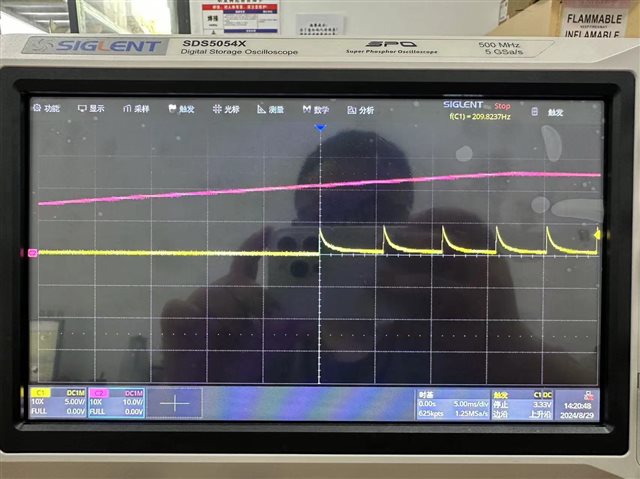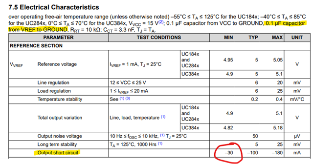 如果黄色波形为 VREF、那么红色波形是什么? 如果红色为 VDD、为什么 VREF 在 VDD = 20V 时打开? UC3845时、UVLO 开/关为8.4V/7.6V、我们应该会 在 VDD~8.4V 时看到 VREF 打开。 此外、当您只需要1μF 时、为什么要在 VREF 上使用0.1μF 电容器? 当 VREF ΔV Δt 电容器时、会产生一个 I=C*Δ V/Δ V...的瞬时峰值电流、 ΔV VREF 的上升时间并使用 Δ VREF、Δt Δ V=5V 和 C=VREF 1μF。 VREF 的最小短路电流为30mA、这意味着如果 Δt <VREF 167μs、您处于 VREF 上进入短路过载的区域。 如果 VREF 进入短路过载、VREF 崩溃、开关将停止、控制器将在显示"失效"波形时重试。 请更改 VREF 电容器、0.1μF。