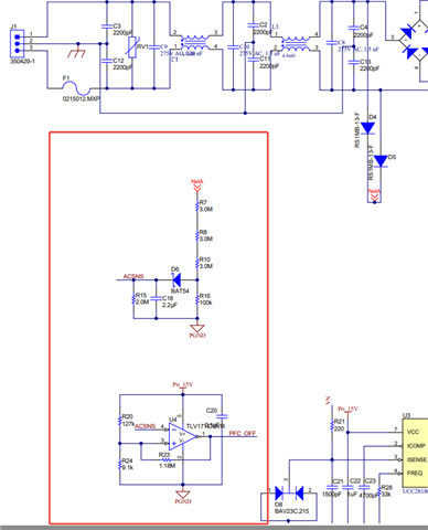 在此参考设计中有一个 ACSNS 欠压检测电路、我在任何文章中都没有找到该电路的特定设计过程、这会让我感到困惑。 我想详细计算 C18和 R15的值、并找到 ACSNS 的电压值来确认比较器的阈值电压。