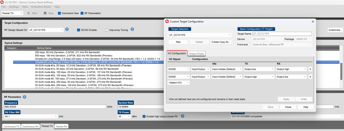 在 SmartRF Studio 中、不会针对每个 TX 数据包重新初始化无线电。 这意味着您始终会看到高 PA 配置中的引脚设置。 您可以在 SmartRF Studio 的“Settings"->"Custom Target“ Target Configuration"“ Configuration"下“下检查 PIN 配置。