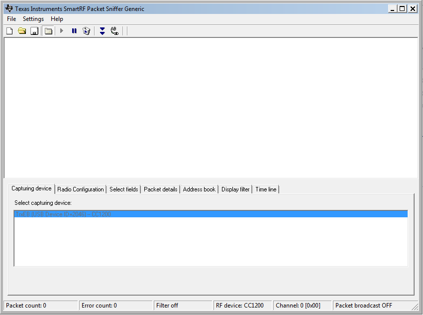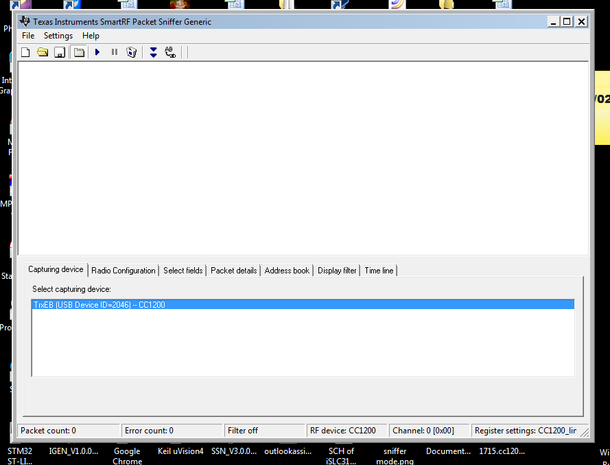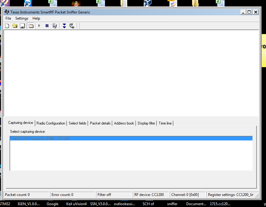 - 现在,当我已将Smart RF TrxEB板连接 到PC USB上并连接了CC1200 RF模块时。 我已经启动了智能封装器嗅探器软件,该软件检测到cc1200模块,但我在数据包嗅探器上没有收到任何RF活动。 因为我们的cc1200 RF模块已经在向 cc1200路由器发送和接收数据。但我 无法看到此SmartRF数据包嗅探器中的任何RF活动。请看下面的两个屏幕:SmartRF数据包嗅探器和具有cc1200的SmartTrxEB开发板 射频模块已连接在其中。