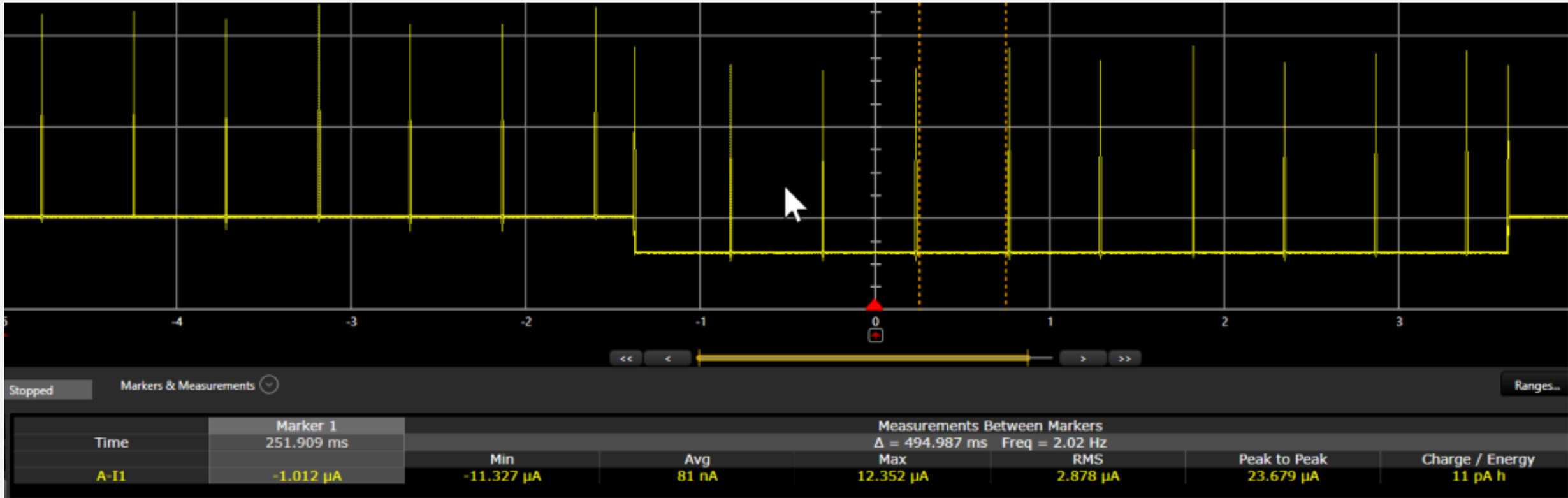 我以 rfpacketTX 为例、将设置更改为 OOK、并测量电流消耗。 数据包之间的电流小于300nA。 它不高的原因是睡眠间隔太短、以至于我没有任何重新变化脉冲。 重新充电时、以 SB 为单位的平均电流消耗约为0.8uA。