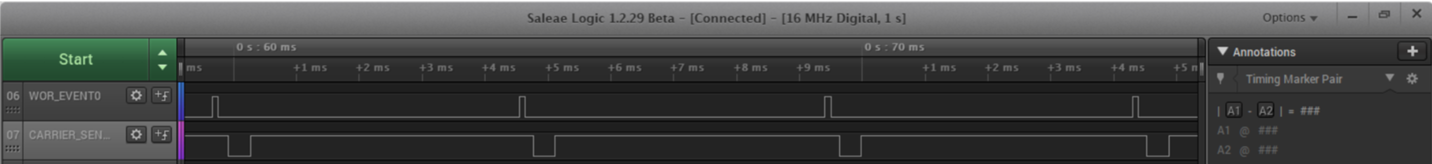 启用基于 CS 的 RX 端接时、对讲机处于 RX 状态的最长时间、因此我认为在对讲机实际退出 RX 之前、此信号不会生效。 另一个"问题"是、该信号在睡眠状态下将硬连线为0或1、具体取决于您选择将其输出到哪个 GPIO (在下面的中、当运行监听模式时、WOR_EVENT0输出到 GPIO2、CARER_SENSE_VALID 输出到 GPIO3: