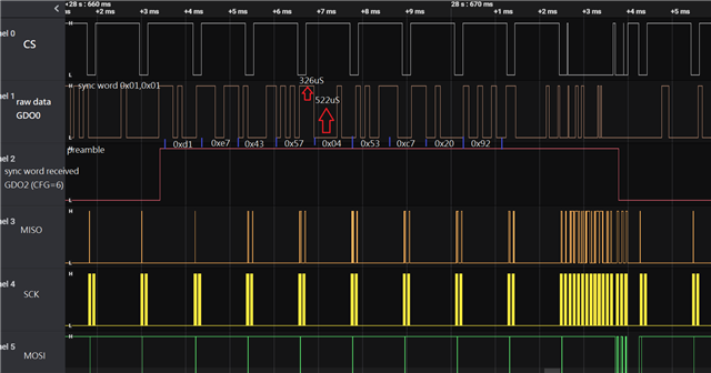 我使用 CC1101来解码 NRZ 433.92MHz 数据速率9600bps。 并通过 GDO0输出原始数据、并通过 GDO2输出同步字接收指示以中断 MCU。 现在、SPI 在第五个字节插入1位"1"时出现问题、导致后续数据不正确。 有人可以帮我解决这个问题吗? 提前感谢您。 初始数据和信号如下。