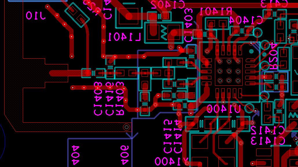 -所有去耦电容都应具有尽可能短的到芯片接地的返回路径。 底层上的电源布线为某些节点创建了一条非常长的返回路径。