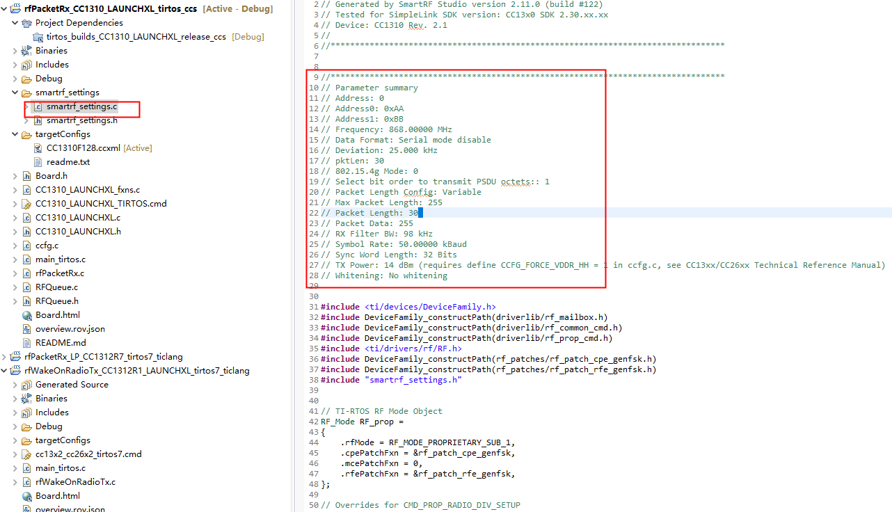 使用 CCS 打开 示例 rfPacketRx_CC1310_run、其中修改了 SmartRF_setting 中的参数、然后将其改回。