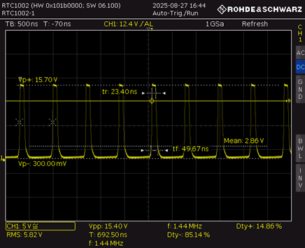开关频率: 工作台和数据表中的分析证实、频率不随温度或负载而变化。 测量:1.5MHz。