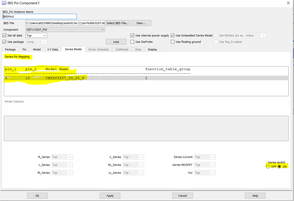 如果您单击 IBIS 引脚、您将获得此菜单-如果您进入引脚菜单(如图所示)、您可以为每个开关分配一个模型。 如果您选择、每个 IBIS 引脚将仿真一个通道或缓冲器。 对于串联开关、您还需要仔细检查串联模型选项卡(如下所示)