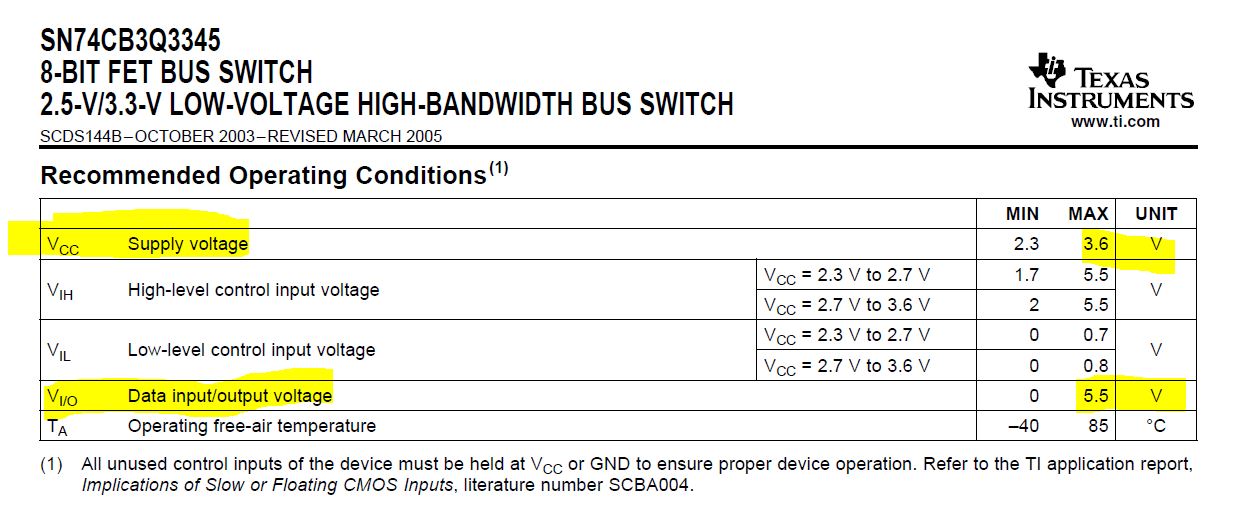 实际上、SN74CB3QXXXX 器件不仅仅是轨到轨开关、因为它们是 NMOS FET 开关、其栅极电压通过电荷泵偏置。 这意味着它们可以支持超出电源轨的电压。 例如、如果您在 Vcc = 3.3V 时为 SN74CB3QXXXX 供电、 并提供5V 的输入信号电压电平、则输出电压电平将约为5V。