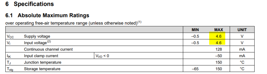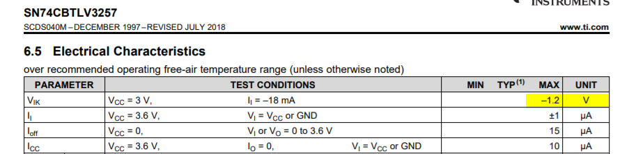 由于您无法更新/更换器件、我想指出、对于 SN74CBTLV3257、根据绝对最大额定值、所选输入引脚上的最小电压为-0.5V。 从数据表复制的关于此额定值的脚注如下: