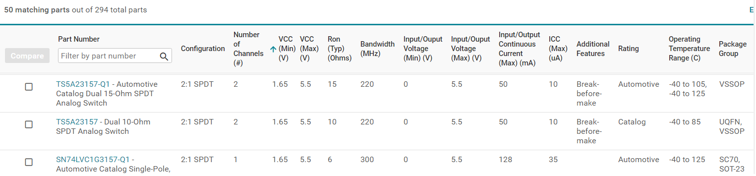 如需未来 参考、您可以使用开关和多路复用器下的 TI.com's 参数搜索、以更快地找到您的解决方案、如下所示: