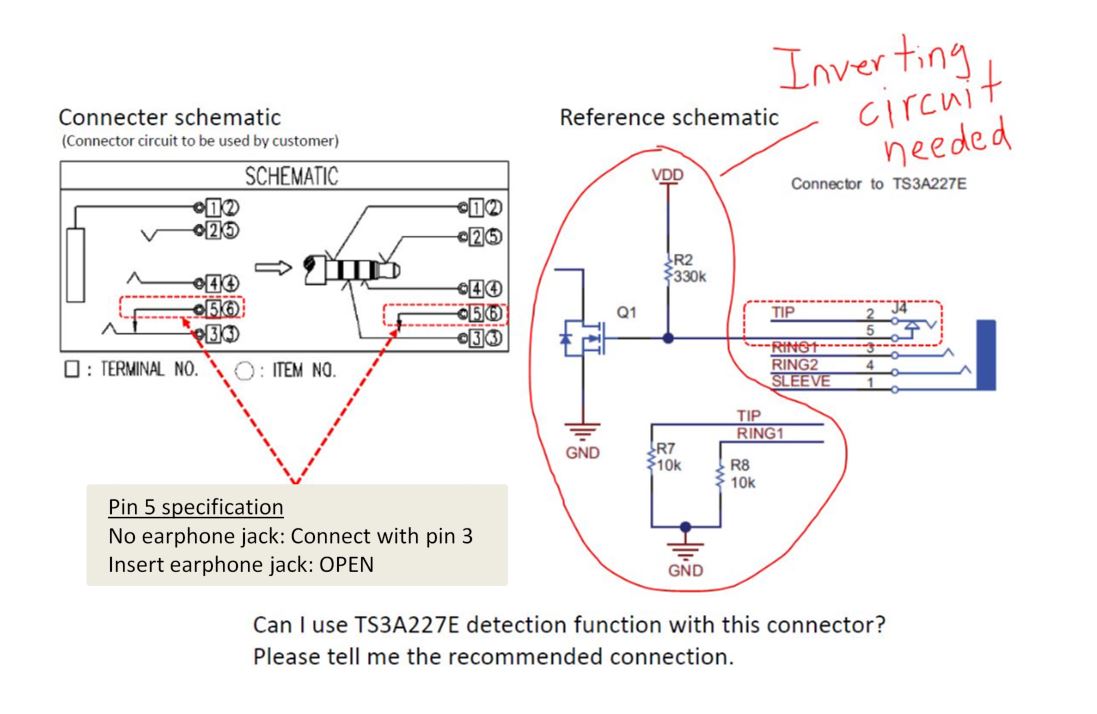 通常闭合的音频插孔不需要反相电路来下拉 TS3A227E 的 DET_TRIGGER 引脚。 但是 、您在上面描述的音频插孔包含一个与音频信号不隔离的开关。 您将无法将音频插孔连接器的引脚3或5上的开关连接到 DET_TRIGGER 引脚、因为内部上拉电阻会干扰音频信号。