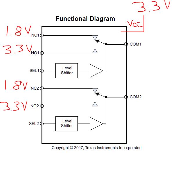 我们需要该组件来支持 NC 引脚3.3V/1.8V 输入和 COM 引脚输出3.3V、因此电平位移功能适用于 NC 引脚而不是 SEL 引脚。