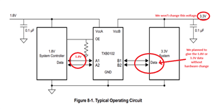 根据随附的方框图、我将 A 侧连接在1.8V (VCCA) Domine、B 侧连接在3.3V (VCCB)。
