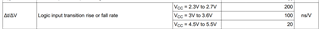 从数据表可以看出、逻辑输入的最大上升或下降时间为 20ns/V (Vcc = 4.5V - 5.5V)。