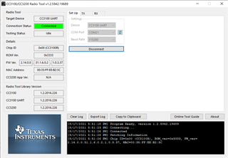 现在、我想使用此无线电测试工具对 SimpleLink Wi-Fi CC3100R1进行一些射频评估和测试。 但是、我无法使用无线电工具连接此 WiFi 芯片 CC3100R1。无线电工具版本是最新版本。但是、我可以通过 CCS UniFlash 连接 CC3100R1。此无线电测试工具 无法连接到 Wi-Fi CC3100R1。 这是因为该工具不适合该 CC3100R1芯片吗?