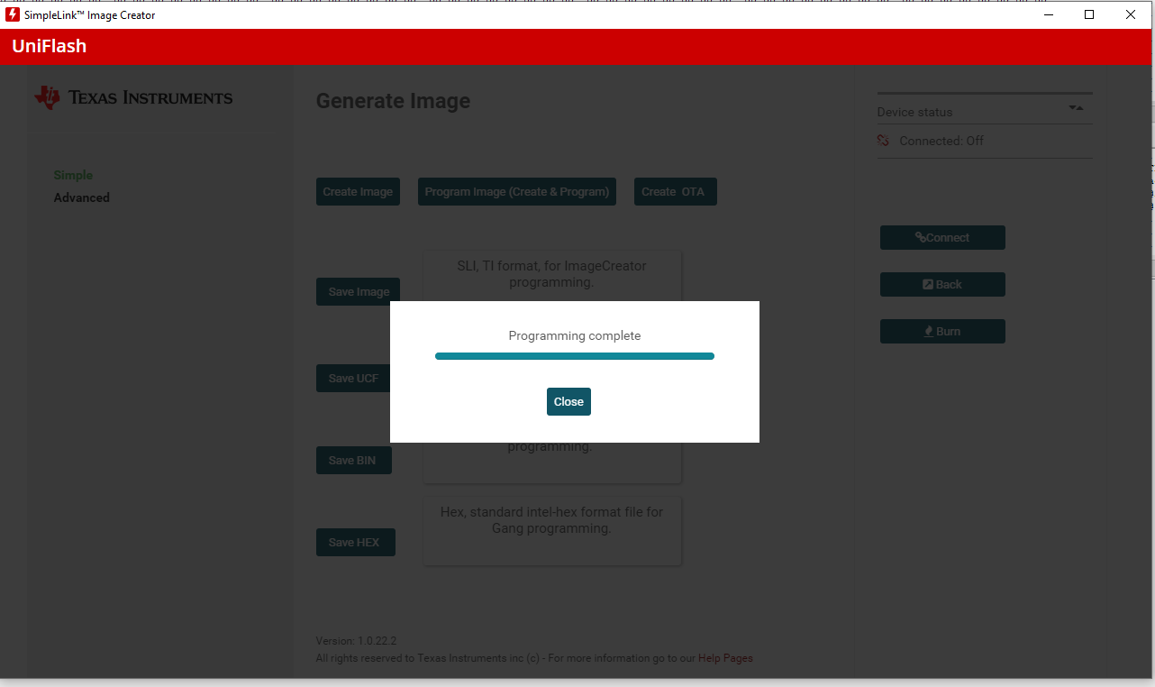 还附加了 uniflash 用于创建组映像的二进制文件(local_time_CC3220SF_LAUNCHXL_tirtos_ccs.bin)