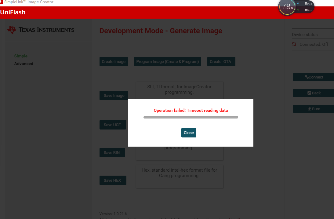 当我使用 UniFlash 烧录 img 时、它报告错误:"operation failed: timeout reading data (操作失败:读取数据超时)"。