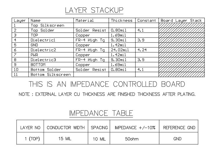 下面是我们在设计中使用的4层堆叠。 您可以 在6层或8层 PCB 中使用相同的结构(顶层和 GND 层之间或底层到电源之间的间距为9.3密耳)。