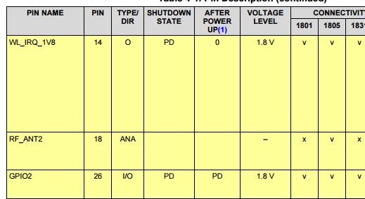 "0"表示逻辑0输出。 该线路可以是逻辑0或逻辑1、WLAN_IRQ 上的内部下拉电阻为100K。