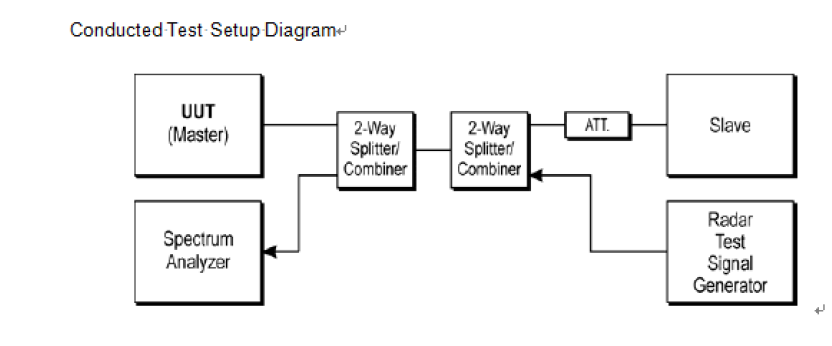 我不清楚您的设置图。 我假设您的 VSG 正在创建雷达测试信号? 然后通过4-1分离器/组合器、端口之间将存在隔离。 这意味着额外的衰减。 此外、我不清楚为什么有2个信号来自主器件、2个信号来自从器件、进入分离器/组合器。  5GHz 信号应该已经通过开关组合、作为 EUT 的一部分(或者我在这里遗漏了什么。 正确设置应如下所示: