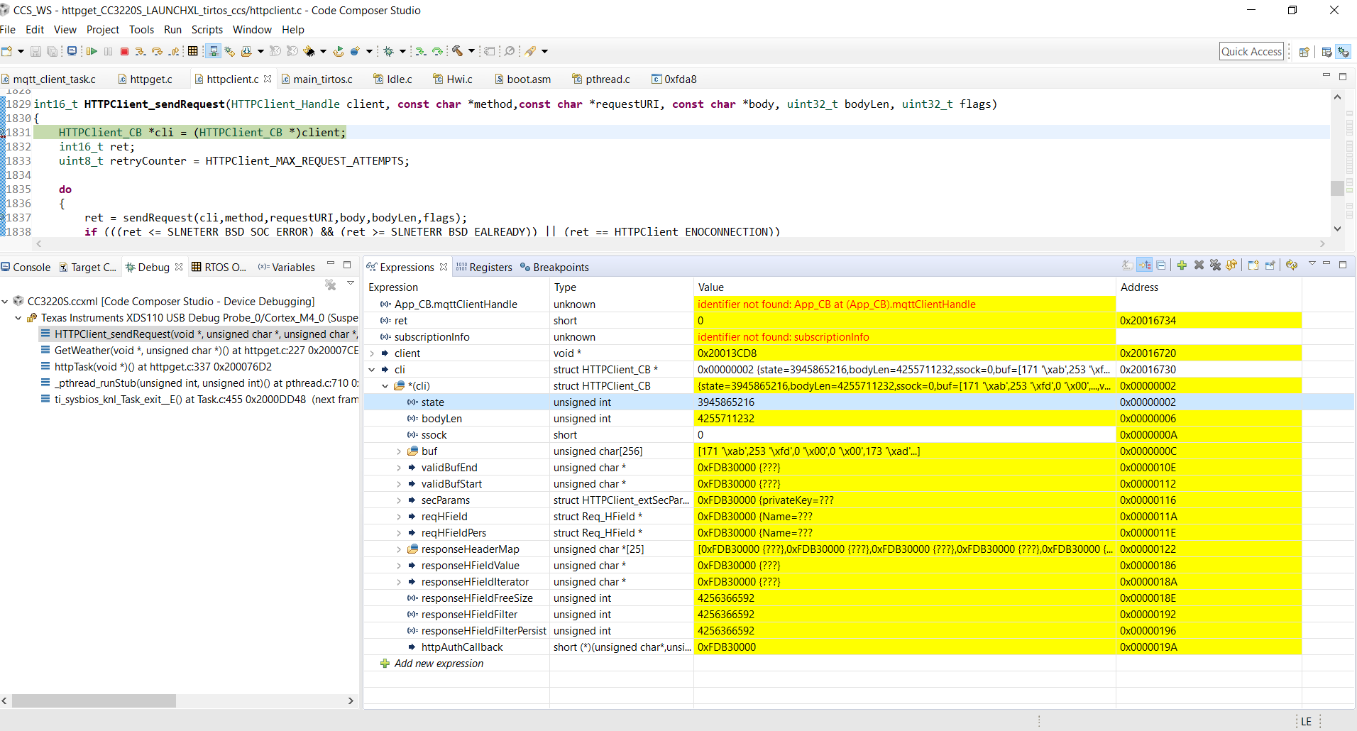 好的,从 HttpClient_sendRequest()获取的错误代码是什么? 此外,如果您单步执行该函数,导致 HttpClient_sendRequest()失败的潜在错误是什么? 若要查找此内容、请将 SDK 中/source/ti/net/http 的 httpclient.c 复制到您的项目中。 然后,您应该能够完全单步执行 HttpClient_sendRequest(),并从中找到导致它失败和调试的确切原因。