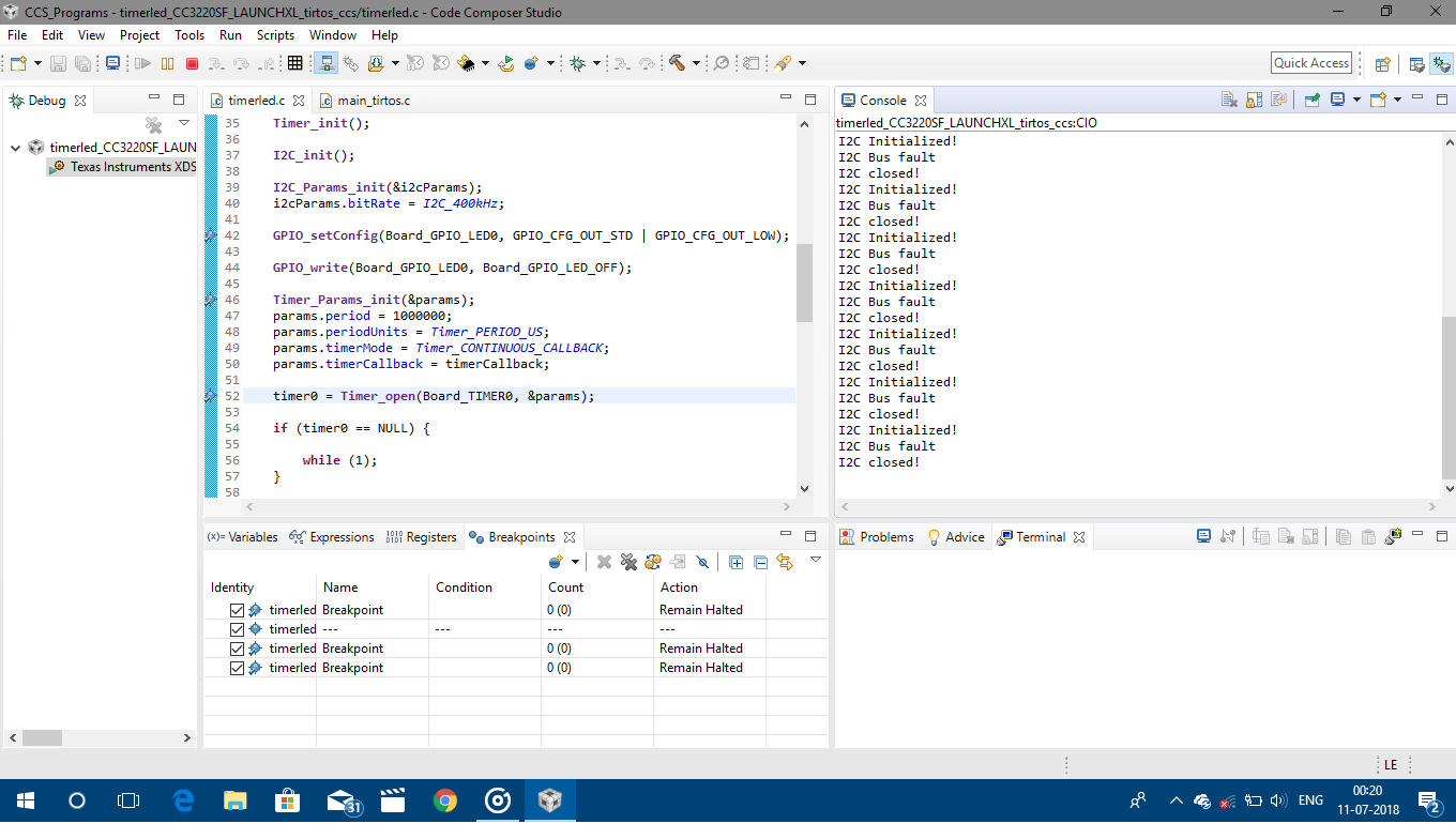 我已将 timerled 和 i2cttemp 示例组合在一起,以获得每秒的温度值,但它给了我错误:I2C 总线故障。