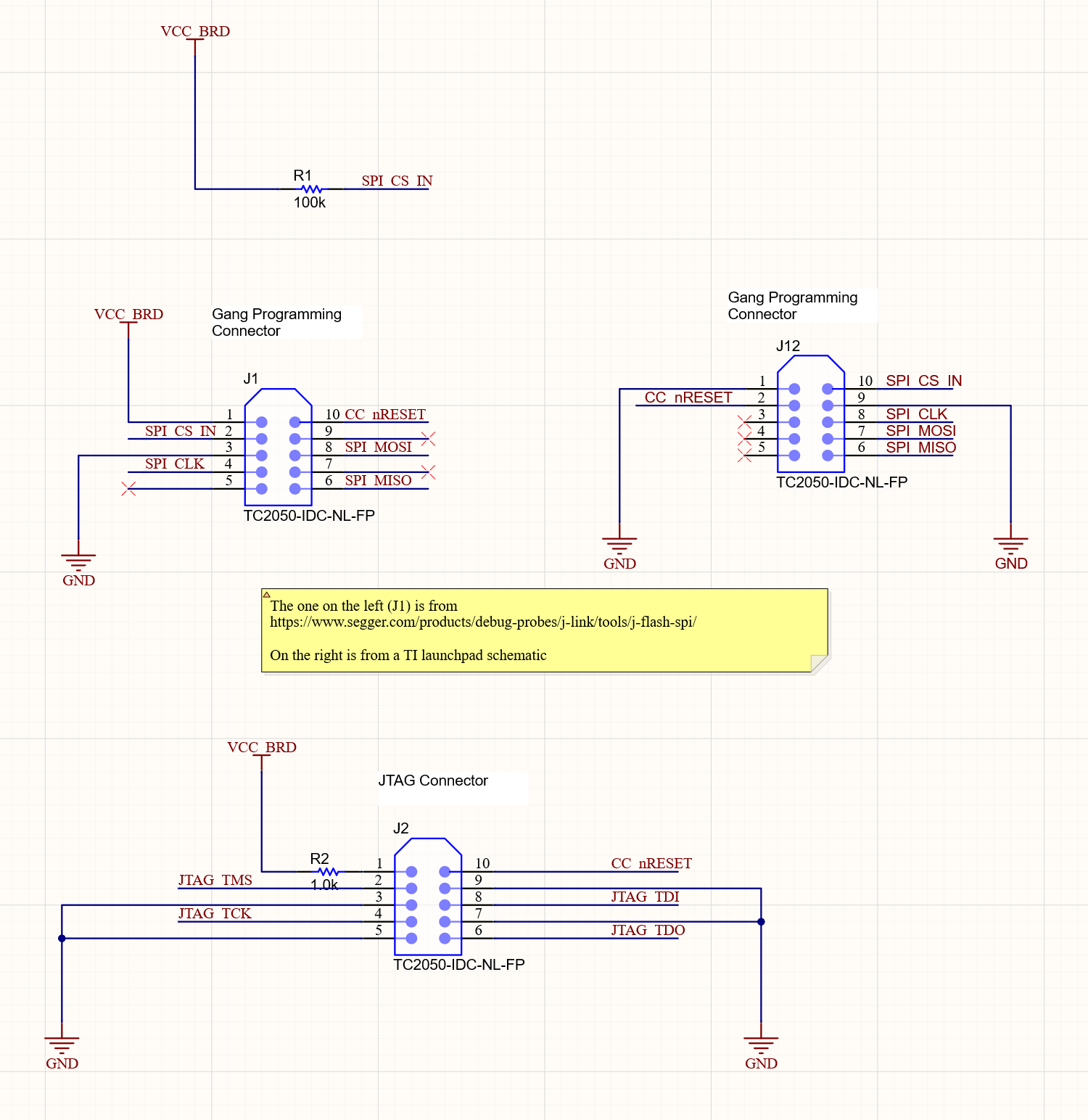 Moda Launchpad 上的 J13具有连接到 SPI 的标签连接接头。 我尝试在电路板上放置一个、但我需要验证引脚排列。 我将 JLINK 与 TC2050 20引脚适配器搭配使用 、并根据 JLINK 和 Tag Connect 提供的数据表在 J1上创建了引脚分配。 J12上的引脚分配是刚刚从 launchpad Gang 连接器复制的引脚分配。