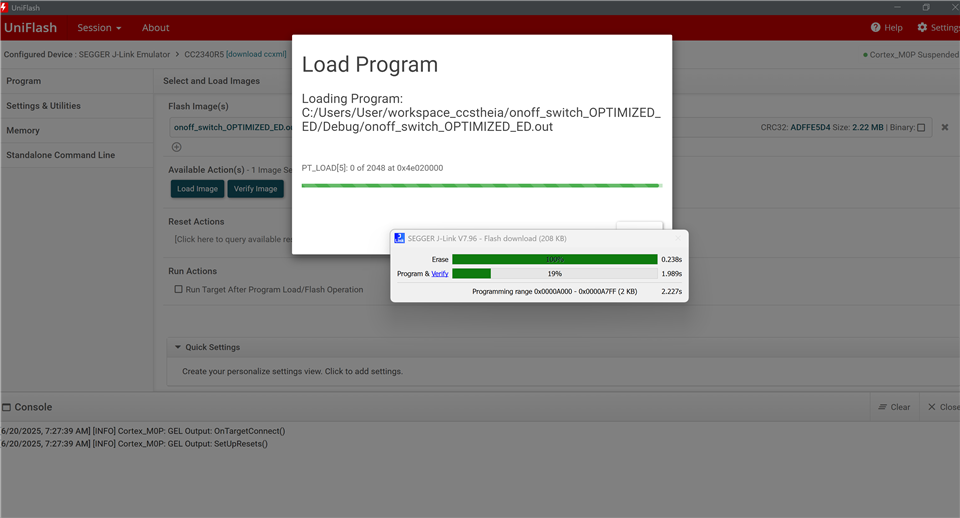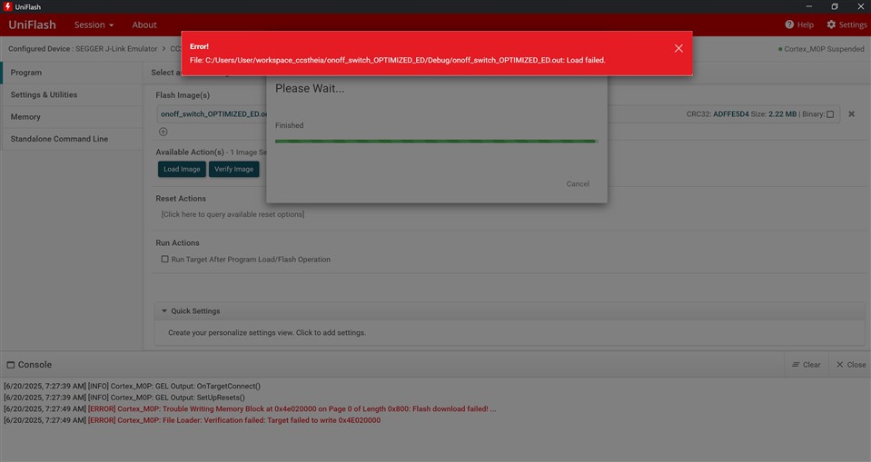 我尝试通过 UniFlash 下载代码、但收到相同的错误: