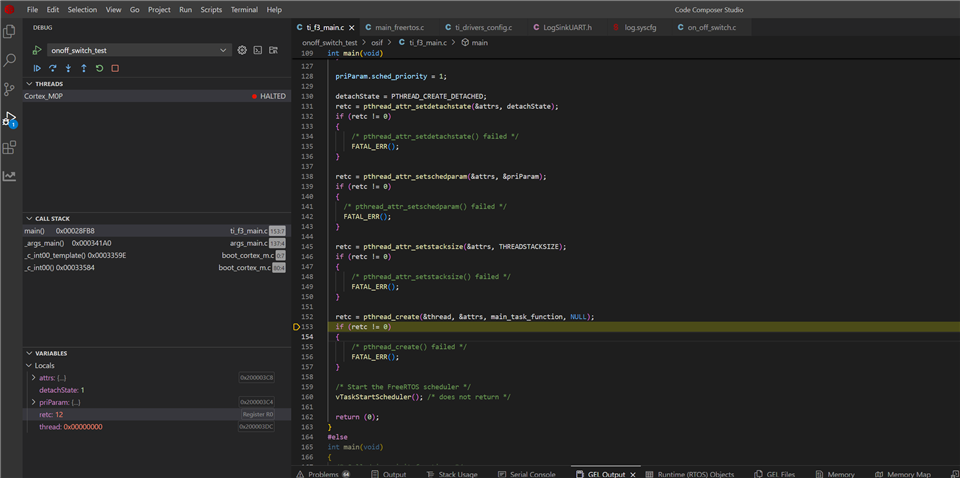 编辑:我将“FreeRTOSConfig.h"中“中的“configTOTAL_heap_size"从“从 0x1bbc 更改为 0x2fff、问题仍然存在。 如何调试此类问题。