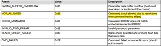 例如、发出 (SACI_CMD_FLASH_ERASE_CHIP) 命令时、电路板以 0x86(不允许)进行响应。