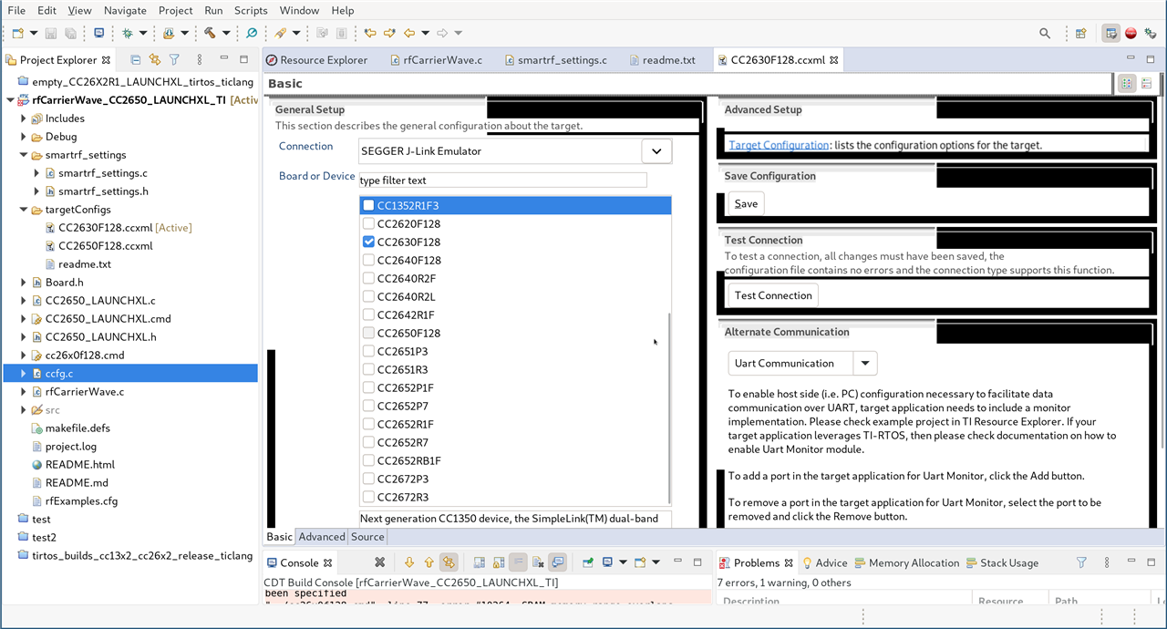 我已经编写了一个基于简化平台启动板/Cc2650的基本自定义板,使用正确的设备=CC2630瓦尔,禁用了尽可能多的设备(按钮,LED 等)