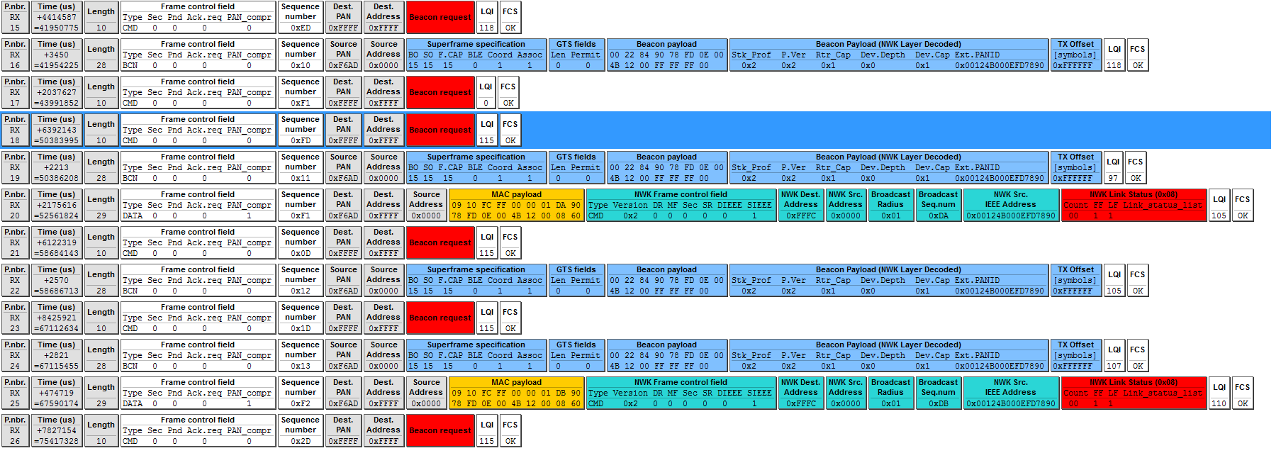 开始时,我给终端设备和协调员提供了电源和正常通信,然后我将关闭协调员,断电1分钟以上,然后协调员再次接通电源。 重复上述操作。 最终,EndDevices和协调器无法通信。 除非两个程序都被擦除并重新加载程序。 使用SmartRF数据包监听器查看数据包,我会发现终端设备发送信标请求,协调员将作出响应! 数据包如下: