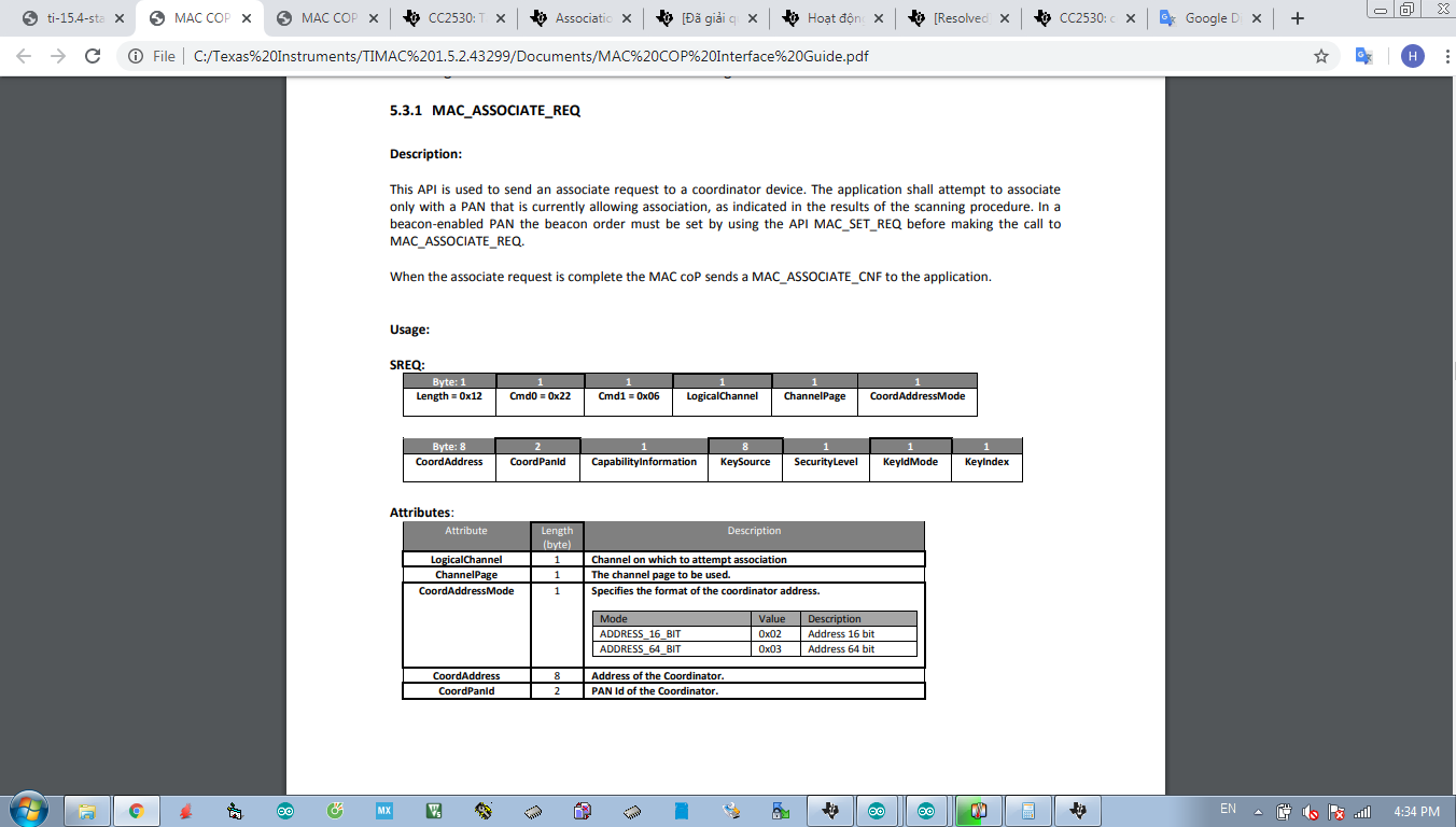 我在文档中看到的一个问题是、当它应该是"MAC_Associate_[REQ/IND]时、它使用"ZMAC_Associate_[REQ/IND"。  尽管如此、监听器日志显示协调器的信标响应、您是否未在网络设备 CoP 上接收到 MAC_BEAKER_NOTIFY_IND?  请参阅5.3.20了解传入数据包结构的外观。  然后、您将发送一个具有相同 CoordAddressMode、CoordAddress 和 CoordPanId 的 MAC_Associate_Req