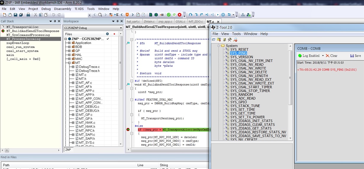 我在调试运行安装在 smartRF06板上的 ZNP 应用程序的 cc2538时遇到问题。 ZNP 应用由 主机 PC 应用程序通过 P412 UART 接头驱动、 我正在使用 IAR 8.30.1进行调试。 事实证明、在调试模式下的程序在启动主机应用程序后不会在断点停止。 在启动主机应用 程序之前、会按预期达到每个断点。 当调试模式处于活动状态时、ZNP 按预期运行。 我已经设置了 count 变量、以确保程序进入设置断点的某些函数。