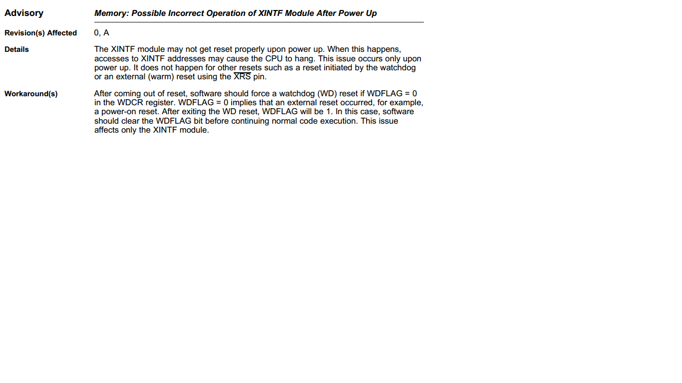 疑问:按照勘误表里的说法,是芯片bug的话,按理说,B板卡应该也会出现上电死机的情况,但是没出现,能帮忙分析下吗(用的F28335都是A版本,一个批次的)?或者给个合理的解释,能够让给领导信服是芯片bug导致的F28335上电偶尔死机。